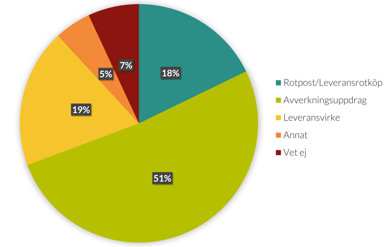 Ca 70 procent av skogsägarna säljer främst skog genom rotpost/leveransrotköp eller avverkningsuppdrag, enligt Skogsbarometern 2025. Skogsägare som främst säljer sitt virke som leveransvirke är 18 procent.