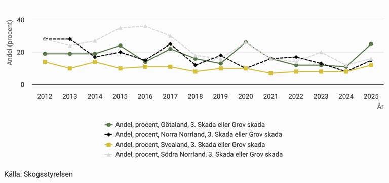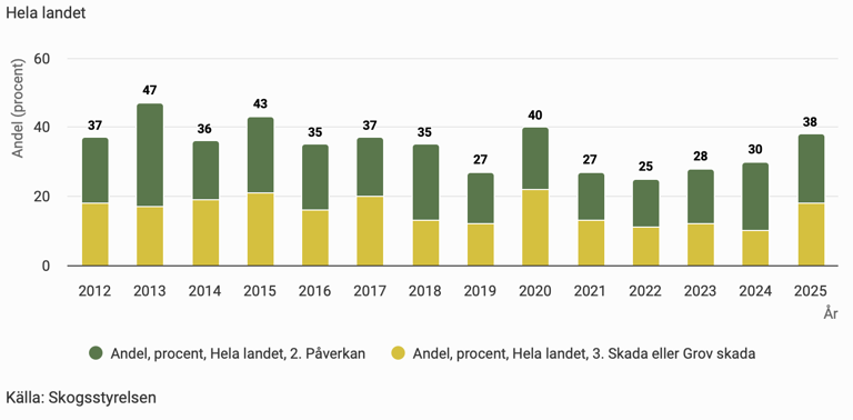 Skogsstyrelsens senaste inventering visar att andelen skador på kända kulturlämningar har ökat vid föryngringsavverkning. Andel kulturlämningar med skada eller grov skada uppgick till 18 procent 2025. Det är den högsta nivån sedan 2020.