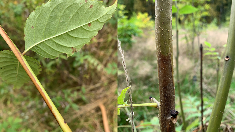Symptom på bladen (bilden till vänster) och nekros (bilden till höger). Foto: Mateusz Liziniewicz, Skogforsk.